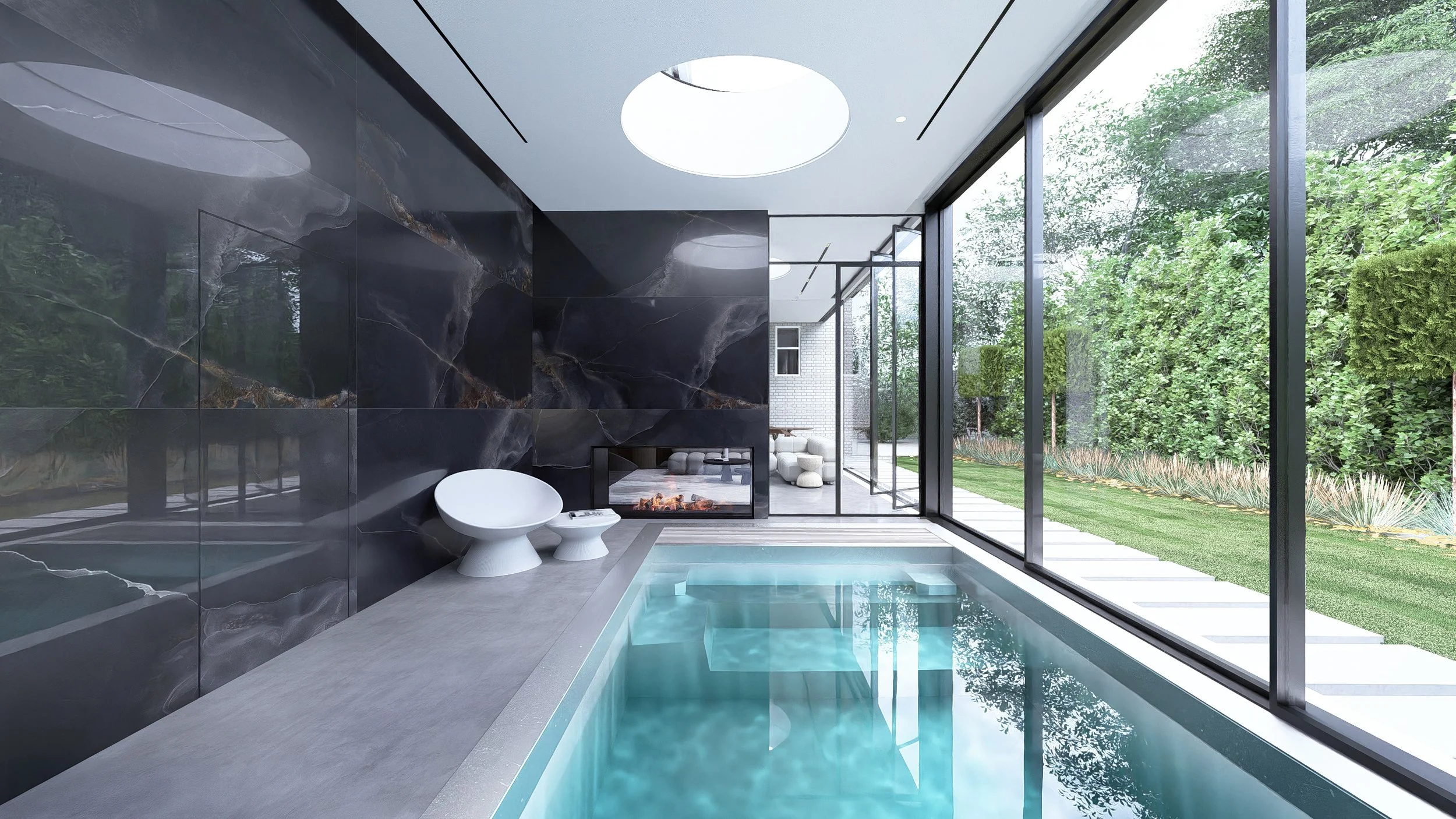 The pool suite is finished with dark marble-effect large-format tiles, lending a sense of understated opulence. Discreet features include a secret door to the garage and a recessed magnetic track lighting system for flexible illumination. A large circular skylight bathes the space in daylight, while the indoor spa pool with swim jet and retractable cover offers year-round enjoyment. The centrepiece—a modern two-way tunnel gas fireplace—links the pool area with the living space, creating both warmth and visual continuity.